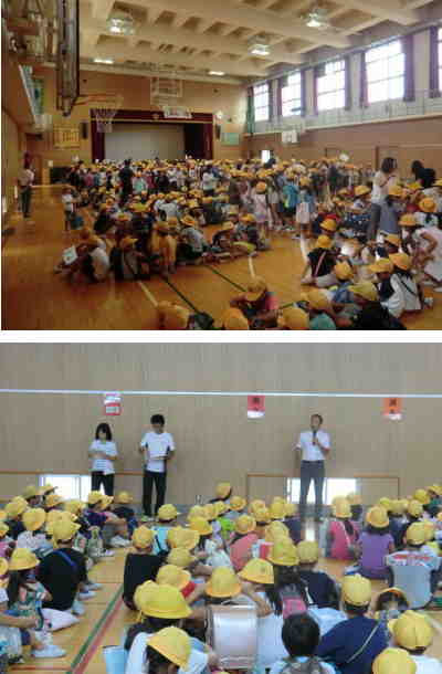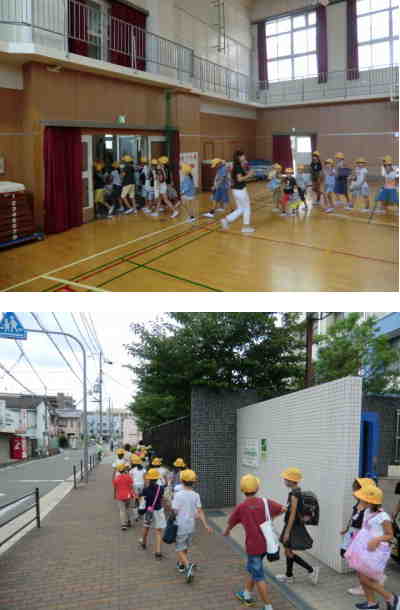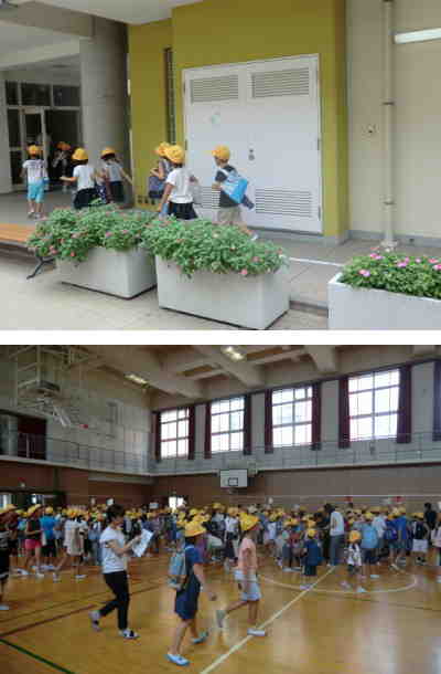 始業式の日には、避難訓練と集団下校も行います。2学期は、大阪市に暴風警報が発令された場合を想定しての避難と集団下校の訓練です。季節がら実際に起こり得る想定なので、全員がいつも以上に真剣に取り組み、スムーズな避難と下校ができました。