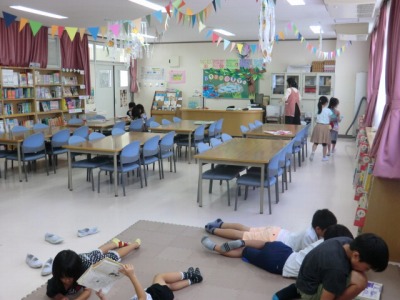 焼野小学校では、図書ボランティアさん、図書委員、学校図書補助員さんの協力によって毎日昼休みか20分休憩時に図書室の開放を行っています。特に水曜日は、学校図書補助員さんがいるので、どの休み時間に行っても本を読むことができます。利用する子どもたちは、思い思いに読書に励んでいます。