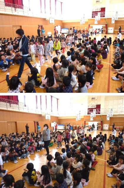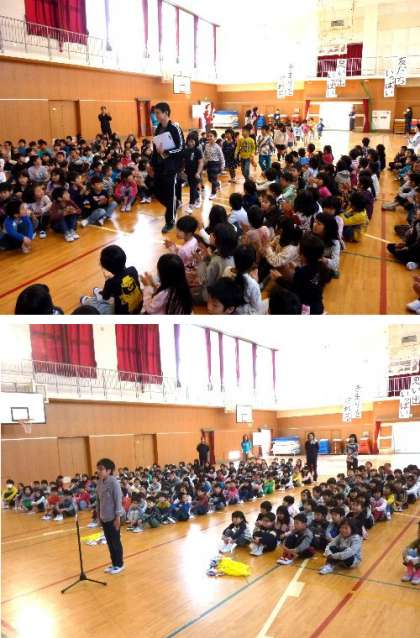 今日は新1年生と2年から6年生のおにいさん、おねえさんとの顔あわせ、対面式をおこないました。1年生を拍手でお出迎えしています。1年生は舞台の上にあがって皆との対面をしました。校長先生から、「上級生としてわからないことをやさしく教えてください。そして、1年生の手本となるようにしてください。」とお話ししました。6年生の代表児童が歓迎のことばを言ってくれました。