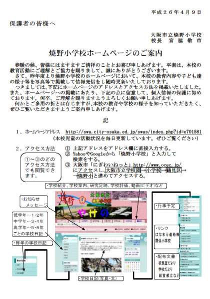 焼野小学校では、個人情報の保護について配慮して、ホームページに写真等を掲載させていただいています。配布プリントにもあるように、配慮して掲載していることをご理解いただいて、写真等掲載の承諾をいただければと思います。よろしくお願いいたします。