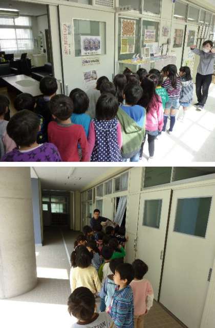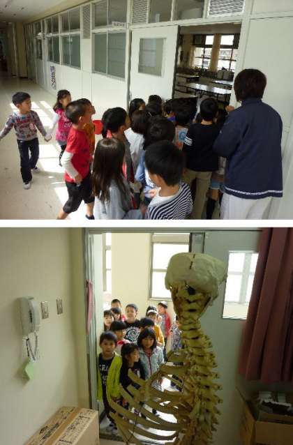 1年生は担任の先生が校舎内の見学につれていってくれました。6年生が対面式で言ってくれた標本がおいてある理科室もばっちり見学しました。本当にガイコツくんがあるでしょう。校長室や職員室も見学しました。もっとよく知りたいことは、今度、2年生が学校探検に連れて行ってくれますよ。お楽しみに!