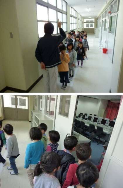 おじゃまします。校舎内の特別教室を1年生が見学しました。りっぱなパソコン室があるね。また皆も授業で使うからね。プールが4階にあったね。授業ではいるのが楽しみですね。5年生の授業している横を静かにとおって見学です。一生懸命に勉強しているからじゃましちゃだめだよ。