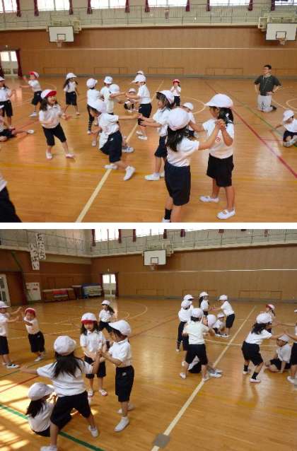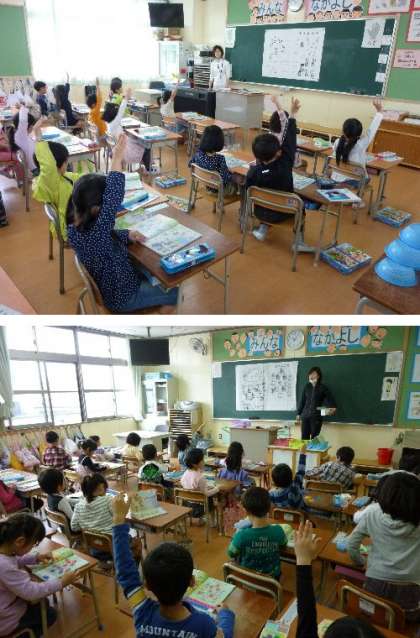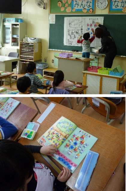 1年生も授業で発表するとき、いい姿勢で手をまっすぐピーンとあげてがんばっていますね。磁石のついたおはじきで数をかぞえたり、だんだん授業が進んでいきます。授業のルールを少しずつおぼえて学習できるようになってきました。体育では、ゲームをしながらグループをつくり楽しんで学習しています。