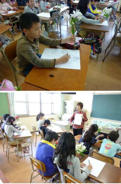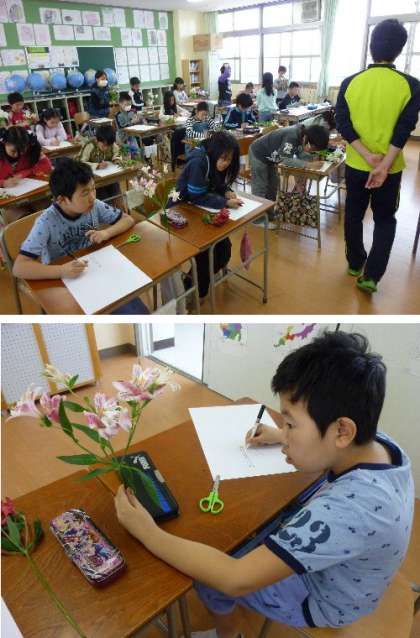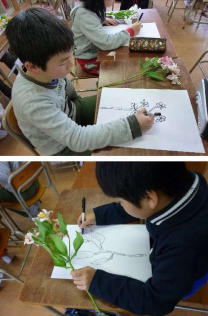 5年生が、お花をしっかり観察して、マジックペンで一発描きに挑戦しています。先週にいただいたアルストロメリアをじっくり見て画用紙に描いています。集中力が必要ですね。じっくり観察して、花の中、おしべ、めしべがどうなっているかを見ながら、精密な絵を描いています。マジックで描くので、失敗しても最後まで描き上げることが大切です。