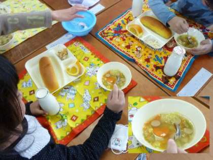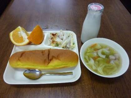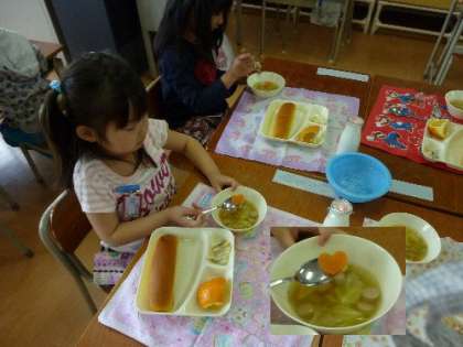 今日の給食に、新しいパンが登場です。まっ黄色なパンプキンパンはふっくらとおいしいです。おかずにはラッキーにんじんが入っていました。ラッキーにんじんをみつけて大喜びです。