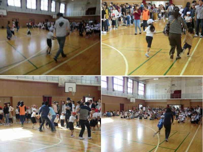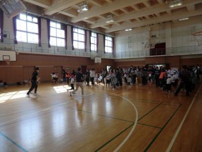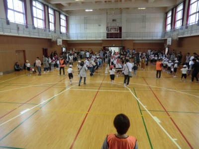本日の土曜授業はPTA集会でした。これは、PTAの学年委員さんが中心となって計画したゲームを保護者の皆さんと子どもが一緒に楽しむというものです。1・2年生は「後ろ向きリレー」をしました。1本の棒を大人と子どもが協力して持ちながら、後ろ向きに走ってリレーをするというゲームでした。後ろ向きに走るという慣れない状況に戸惑いながらも、みんな楽しみながら大いに盛り上がりました。
