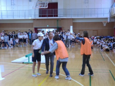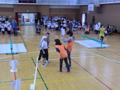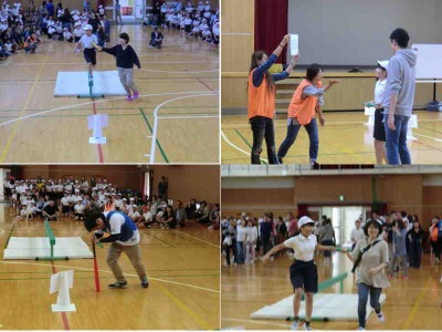 5・6年生は「どのコーン?親子でドキドキ計算」をしました。これも大人と子どもがペアになり、平均台を渡ってから、計算問題にチャレンジし正解を出してからゴールを目指すというゲームです。このゲームもリレー方式で行われ、アンカーは各学級の担任の先生でした。先生には計算問題だけでなく、グルグルバットという課題も設定されていました。また、途中で校長先生の登場場面もありました。