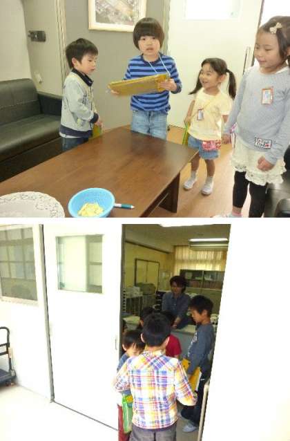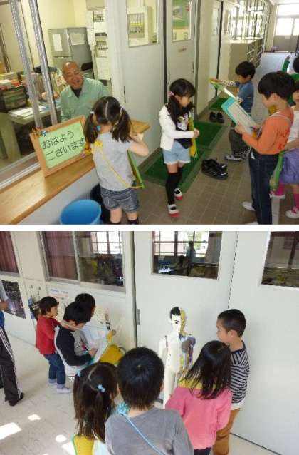 2年生が1年生を校長室までつれてきてくれました。校長室の説明を一生懸命にしてくれています。各探検場所にはカードがあります。そのカードを1年生が集めてもらいのす。後から、もう一度学校探検をふりかえて学習するときに使います。事務室や管理作業員室でもカードを受け取っています。理科室には模型が出迎えてくれていました。