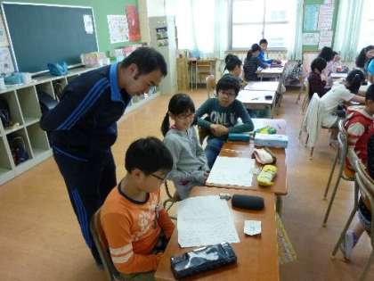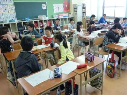 6年生が「風切るつばさ」で書いた文章をペアになって読みあっています。がんばってます。
