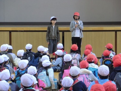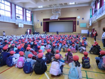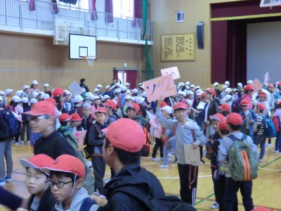 朝方まで雨が降っていたので実施が危ぶまれた全校オリエンテーリングですが、みんなのパワーで雨も上がり無事に実施することができました。活動の様子を紹介します。まずは、出発式の様子です。