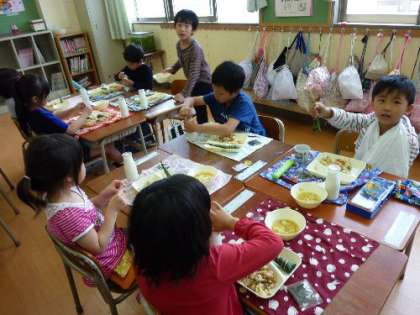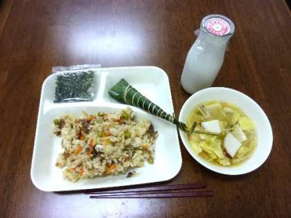 今日の給食は、子どもの日にちなんだ特別給食でした。牛肉のちらしずし、五目じる、ちまきでした。1年生は「これ何?」とちまきを珍しそうにしていました。おいしそうにたべていました。