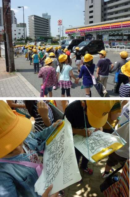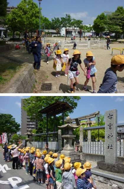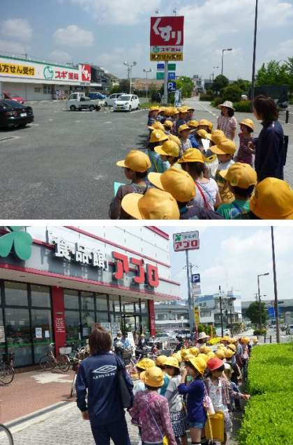 通りのにぎやかな、コンビニまででてきました。ここは、自動車がたくさん通る交差点なので、気をつけなくてはなりませんね。少しだけ校区を離れて、古宮神社のほうまできました。ここで、ひと息いれて、水稲からお茶を飲みました。さらに歩いて、今度は薬局とアプロまできましたね。