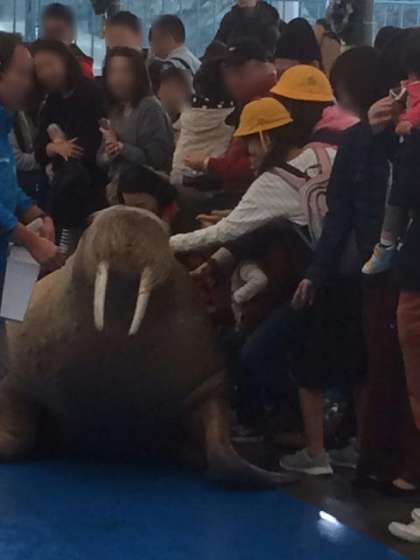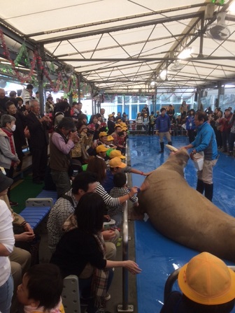 水族館での楽しみの一つである各種のショーも見学します。セイウチショーでは、セイウチにタッチできる場面もありました。