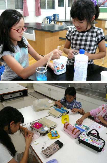 毎週木曜日の六時間目はクラブ活動です。アウトドアクラブは今日は雨だったので室内で班別の対戦をおこないました。科学クラブでは、色とりどりのスライムを作りました。金色や銀色も人気でした。ていねいに混ぜないとうまくできません。家庭科クラブはぬいぐるみづくりです。ダンスクラブではポーズがきまってますね。だんだん仕上がってきました。