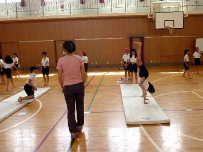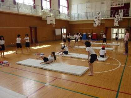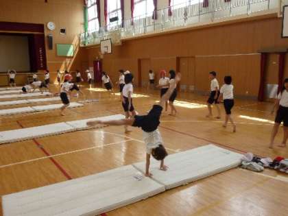 4年生が体育を体育館でマット運動をしています。側転の練習です。うまくきれいにまっすぐにできるようがんばっていますね。けっこうむずかしいです。