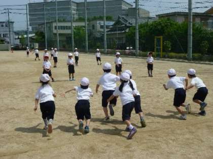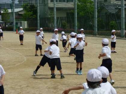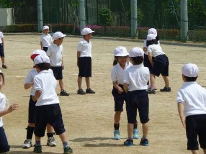 1年生は、運動場で元気よく体育をしています。走って行って関所でじゃんけんしたら戻ったりと、ゲームを取り入れ楽しく身体を動かしています。天気もよく気持ちいいね。