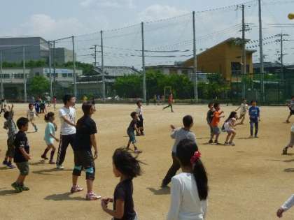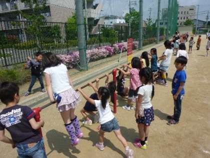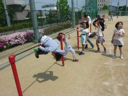 休み時間には、たくさんの子どもたちが運動場であそんでいます。3年生が先生もいっしょにボール遊びをしています。鉄棒では逆上がりの練習をしている1・2年の子どもでいっぱいです。手のまめを見せてくれました。楽しそうにがんばっています。