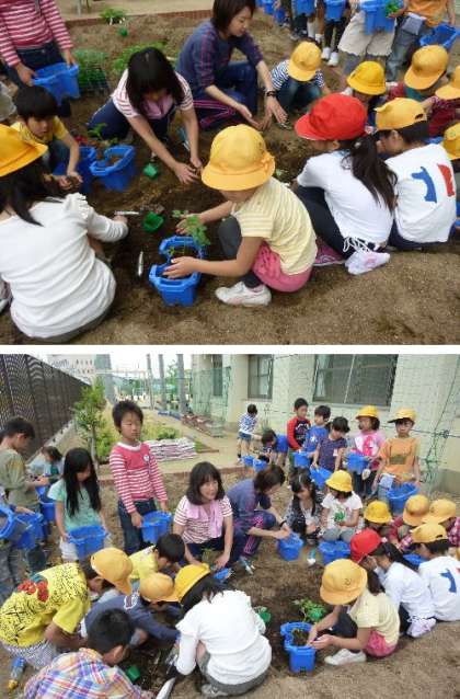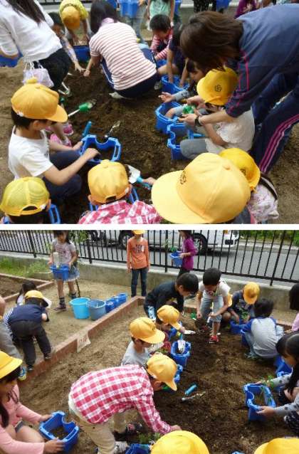 2年生は、昨年あさがおを植えた鉢に、新しい土を入れてトマトの苗を植えました。なかなかうまく苗をとりだせなくて苦労しました。やさしく手で土を入れて水をあげました。おいしいミニトマトがなるといいね。