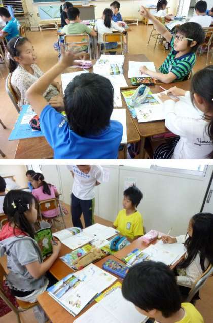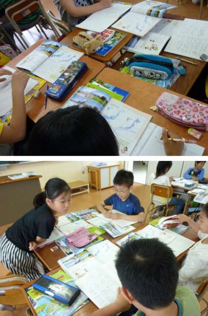5年生が、日本地図をみて、日本の気候にどんな特徴があるか、班で考えました。春夏秋冬の四季がありますね。みんなで意見をだしあって学習しています。