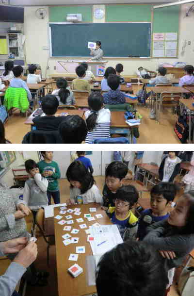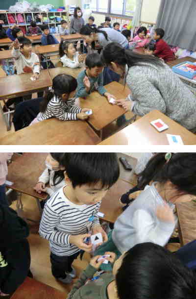 今日は1・2年生の各クラスで、「英語を楽しく学ぼう」の特別授業がありました。これは、学期に1回ずつ外部から講師の先生に来ていただき、英語の学習に取り組むというものです。本日の内容は、カードを使ったゲーム形式の学習で、色と形の英語での表現の仕方につて学ぶものでした。