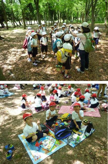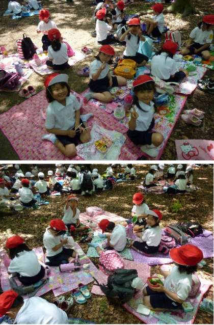 大阪城公園の木かげでお弁当をみんなで食べました。とってもおいしかったね。おいしいお弁当ありがとうございます。