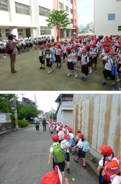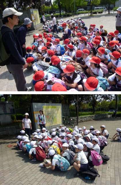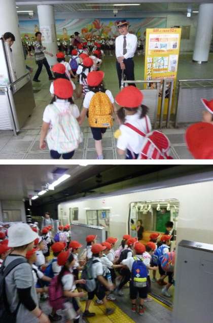 今日は、1年生と2年生が校外学習で、大阪城にでかけました。昨日はたくさん雨がふっていたので、天気が心配でしたが、朝には晴れて暑いぐらいのよい天気になりました。