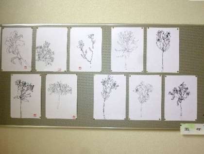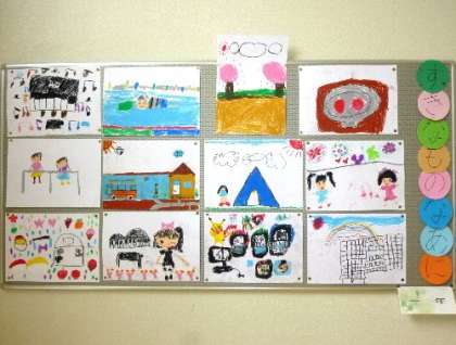 1年生の掲示版には「すきなものなあに」、5年生の掲示版には花の絵が掲示されています。とてもよく描けていますね。