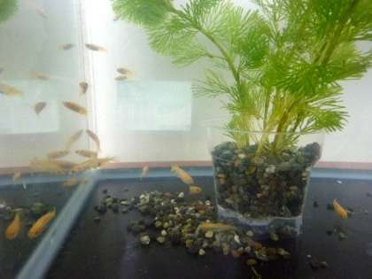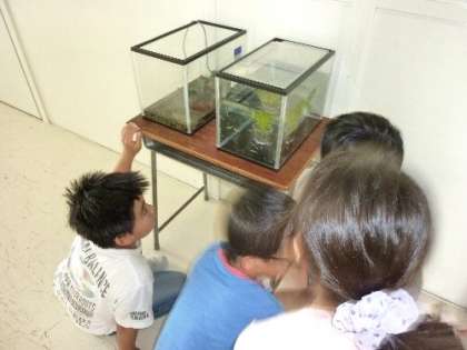 5年生の教室前の水槽には、めだかがたくさん泳いでいます。授業などで観察したりするために、学級でエサをあげて育てています。