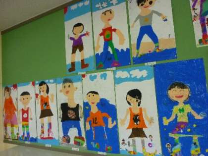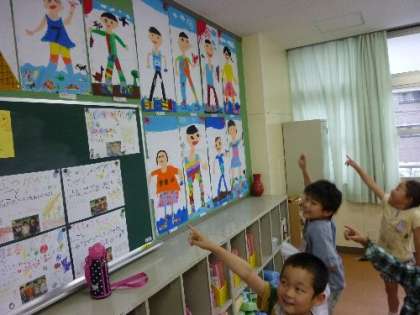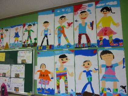 2年生の教室のうしろには自分で描いた自画像が掲示されています。教室に行くと、「これがわたしの!」「みてみて」と一斉に声があがります。とてもうれしい気持ちになりました。本当によく描けていますね。