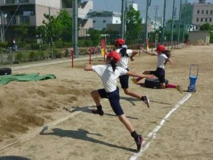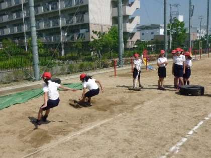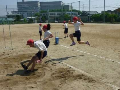 6年生が体育の時間に走り幅跳びを練習して計測しています。なかなかうまく足をそろえて着地するのがむずかしいです。もうすぐスポーツテストもあります。タイミングをつかめるよう練習をしましょうね。