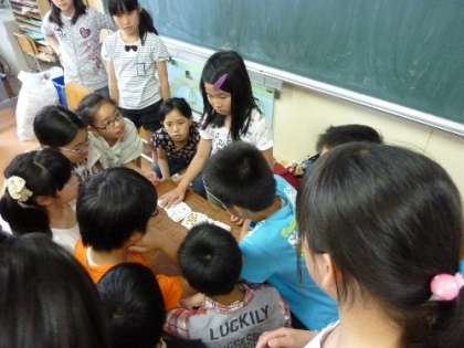 6年生がおたんじょび会をおこなっています。プログラムにそって楽しみました。ちょうどトランプでマジックをしていました。みんなの視線が集中しています。