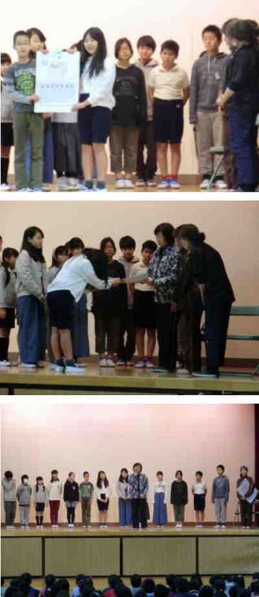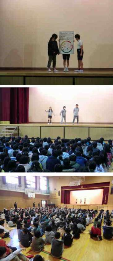 3学期最初の委員会発表は、給食委員会でした。初めに学校給食の歴史の紹介があり、その後、給食調理員さんへの感謝の気持ちを伝えました。また、全学級で協力して作ったカレンダーを贈りました。それが終わるといつものように活動の様子を劇にして紹介しました。最後に食べ物に関するクイズがあるなど、とても盛りだくさんの発表でした。