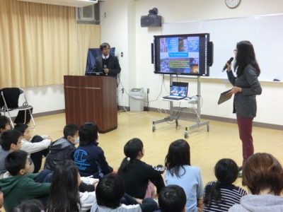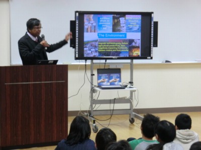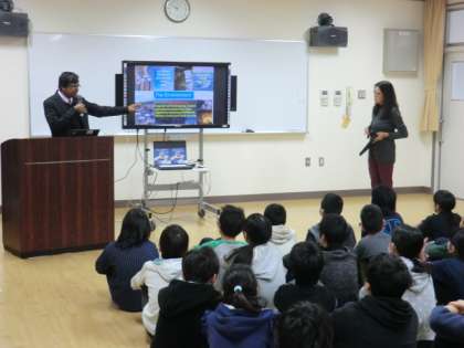 6年生で毎年行われているUNEPによる出前授業がありました。UNEPとは国連環境計画の略称で、大阪にある唯一の国連機関です。そこの所長さんにお越しいただき、水や大気の汚染など、地球全体を取り巻く環境の問題についてグローバルな視点で教えていただきました。