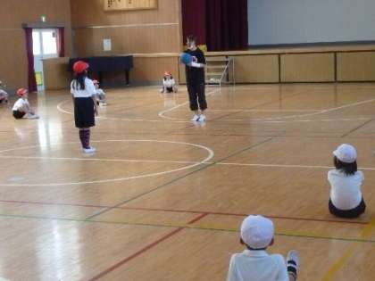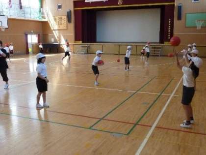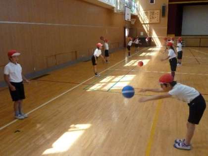3年生の体育が体育館で行われていました。二人一組になってボールをバウンドして受け渡ししています。うまく相手がとれるボールをなげることが大切ですね。