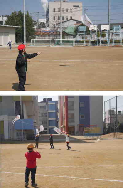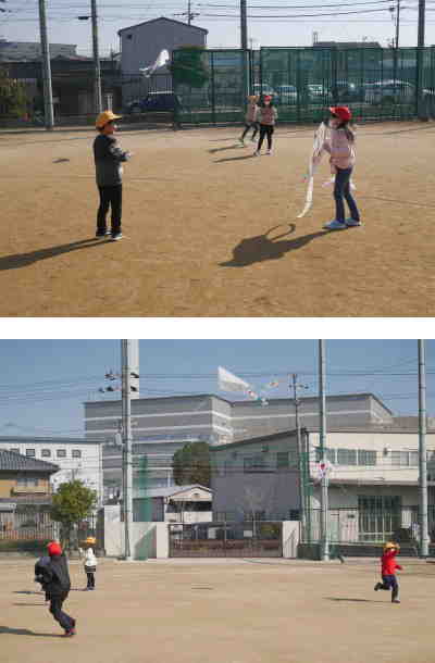 1年生が生活科で「むかしあそび」の学習をしています。地域の方に教えていただいた「昔あそび」に続いて、今日はたこあげにチャレンジしました。子どもたちは冷たい風が吹く中、運動場に出て元気に走り回りながら、自分たちで作ったたこをあげていました。