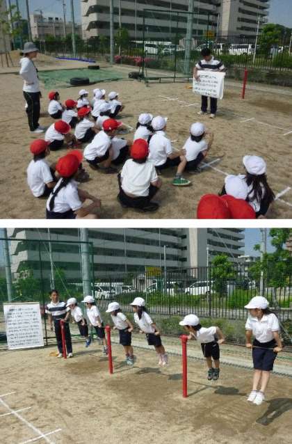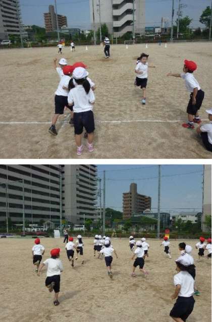1年生が体育で音にあわせて、走ったり、集まったり、すばやく行動できるようがんばっています。