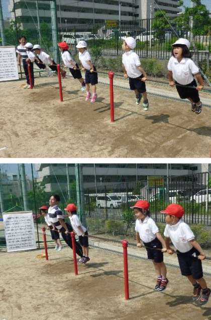 鉄棒はつかまって身体を伸ばして降ります。歌をうたいながら楽しく運動しています。