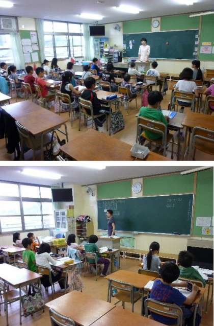 4年生の算数では、それぞれの児童の習熟にあわせて、2クラスを3つに分割して授業をしています。教室がないので、多目的室で長机をだして学習しています。教室によって、人数の差があります。子どもたちの学習状況にあわせて、わかりやすく学力が定着できるように授業をすすめています。