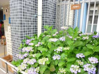 今年も正門を入った右わきに、あじさいがきれいに咲きだしました。まもなく梅雨をむかえる時期ですが、あざやかに花びらがきれいですね。じっくりとみてください。