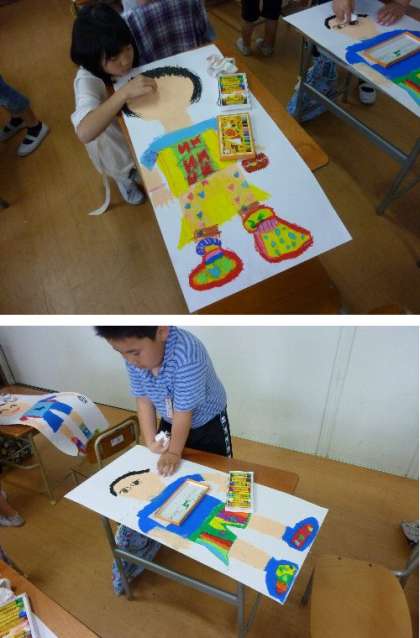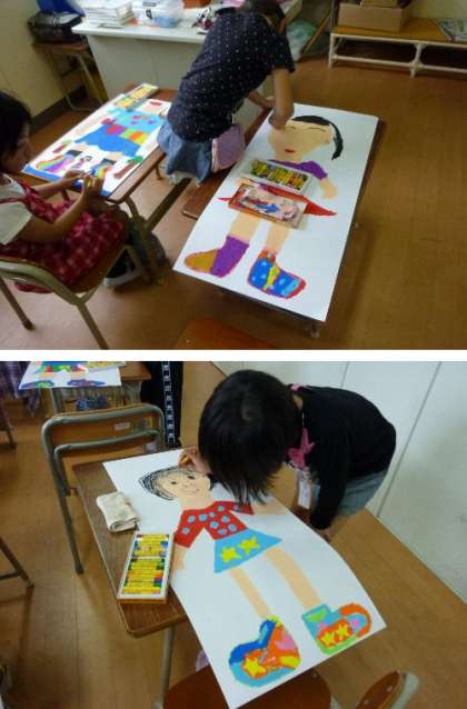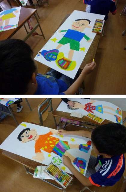 2年生の図工です。まほうの靴を描いています。その靴をはいている自分が大きく迫力ある絵を描いていますね。どこに行こうかな。真剣にクレヨンてせぬって完成させています。