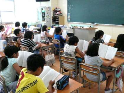 4年生でみんなで大きな声で本読みしています。文字に集中しています。