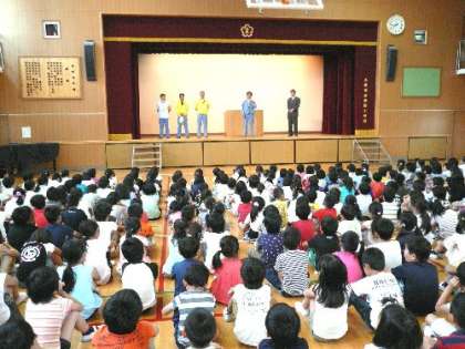 今日の児童朝会で、鶴見区役所からこられた安全パトロール隊の方々をご紹介いたしました。「あいさつをしっかりしましょう」「自転車の二人のりは危ないよ」というお話がありました。安全パトロール隊の方を見かけたらしっかりあいさつできるようにしましょう。