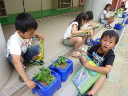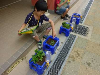 あさがおの種から双葉がでて、またまた大きくなってきています。一緒に雑草もそだっちゃってしまい抜いています。1年生の成長とともにあさがおもどんどん大きく生長しますね。