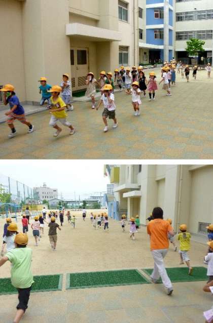 今日の2時間目に第1回目の避難訓練をおこないました。4階の家庭科室からの出火で全校児童が校庭に避難しました。帽子をかぶり、ハンカチを口にあてて、運動場ではすばやく行動して集結しました。訓練開始放送から集合して人員点呼確認まで、3分35秒かかりました。
