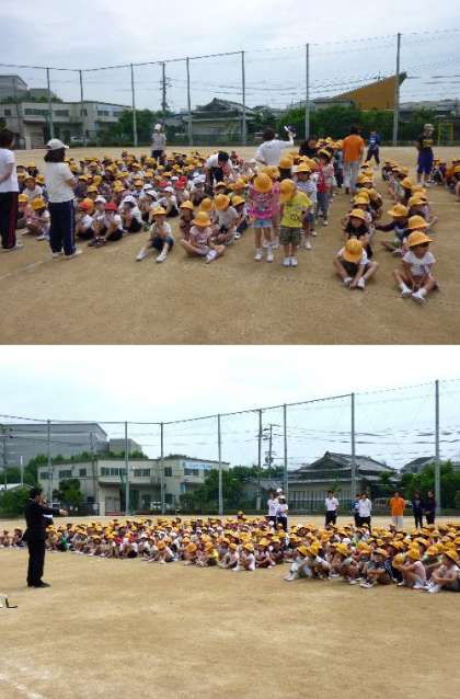 最後に校長先生からお話ししました。人を押さない、校内では走らない、しゃべらない、避難したらもどらないことが大切です。そして、自分の耳で聞いて考えて行動することが大切です。まわりの様子をみて行動するのではなく、率先して避難することをしてください。焼野地域の防災訓練が6月15日(日)にあります。日ごろからの準備が大切です。