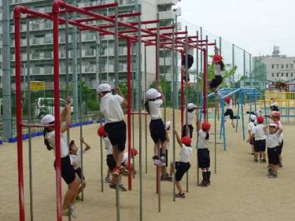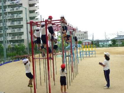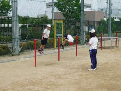 2年生の体育で、のぼり棒のぼり、鉄棒逆上がりを練習して、先生にみてもらっています。あきらめずにがんばりましょう。