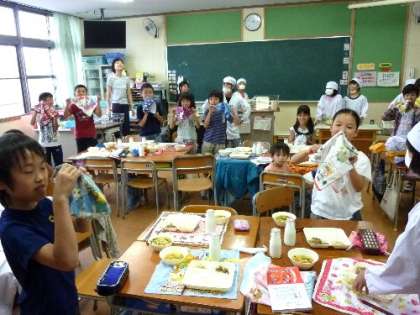 給食の時間に校長先生が手品を披露していると、今度は4年生が手品をみせてくれました。ハンカチが浮いているではありませんか。なかなかやりますね。