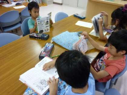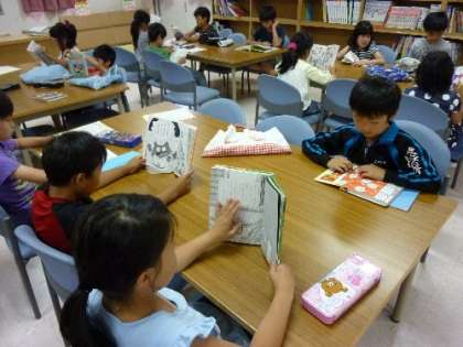 3年生が図書室で読書しています。静かに読んでいます。本からいろいろなことがわかるね、おもしろいね。