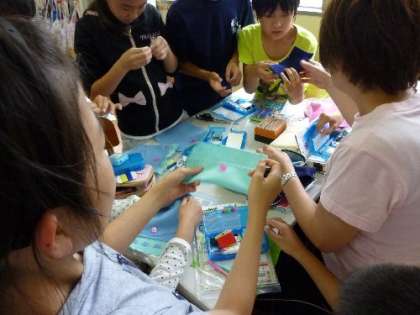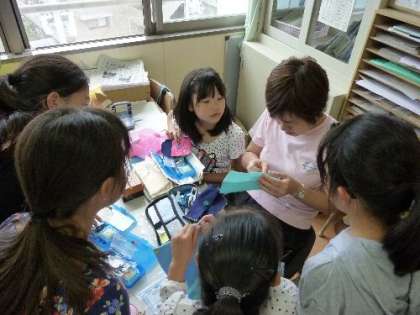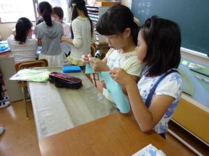 5年生が楽しく小物づくりにはげんでいます。家庭科でならった針と糸に苦戦しています。