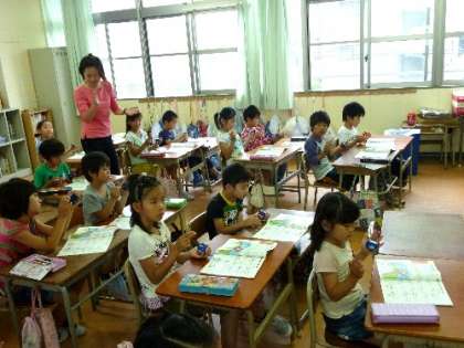 2年生が、カスタネットでリズムをとる練習をしています。2拍子を感じながらうってます。タンとタで調子を整えてます。